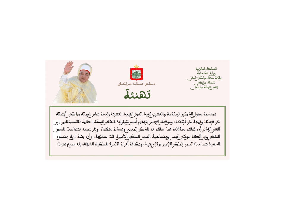 تهنئة السيدة رئيسة مجلس عمالة مراكش لجلالة الملك محمد السادس بمناسبة حلول الذكرى السادسة والعشرين لعيد العرش المجيد.