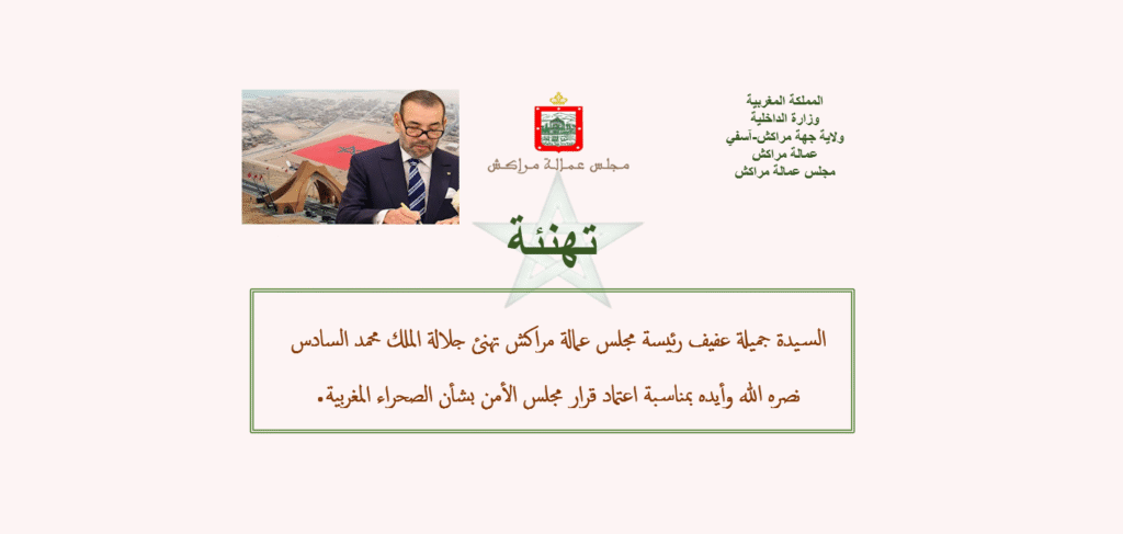 تهنئة رئيسة مجلس عمالة مراكش لجلالة الملك محمد السادس نصره الله بمناسبة ذكرى عيد الاستقلال المجيد اقرأ المزيد